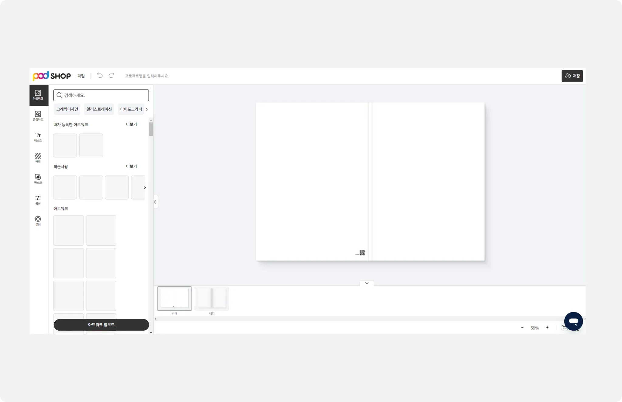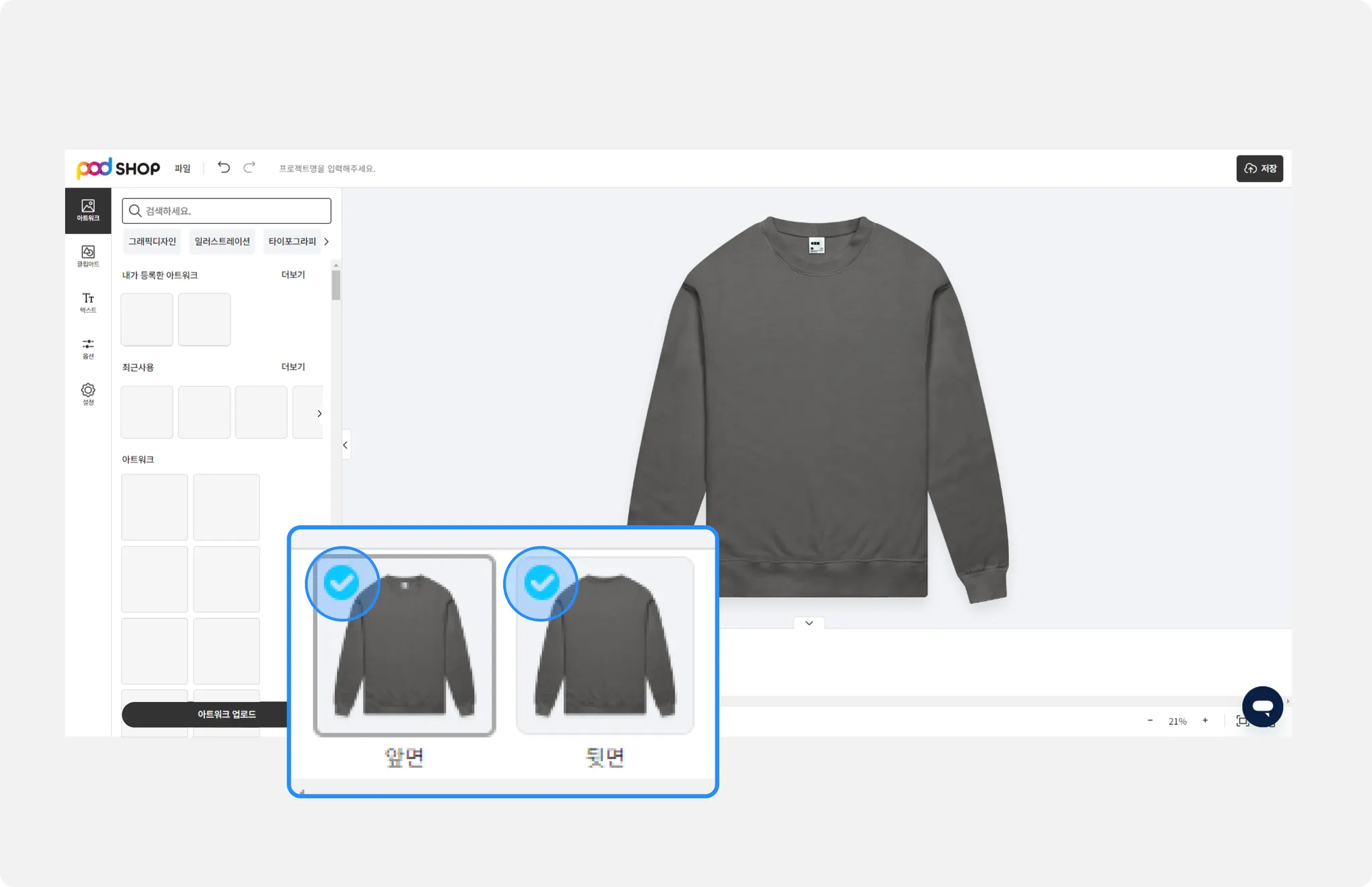 POD SHOP에서는 브랜드의 디자인 파일, 텍스트, 배경 등을 자유롭게 배치하여 상품을 디자인할 수 있는 관리자 편집기를 제공합니다.