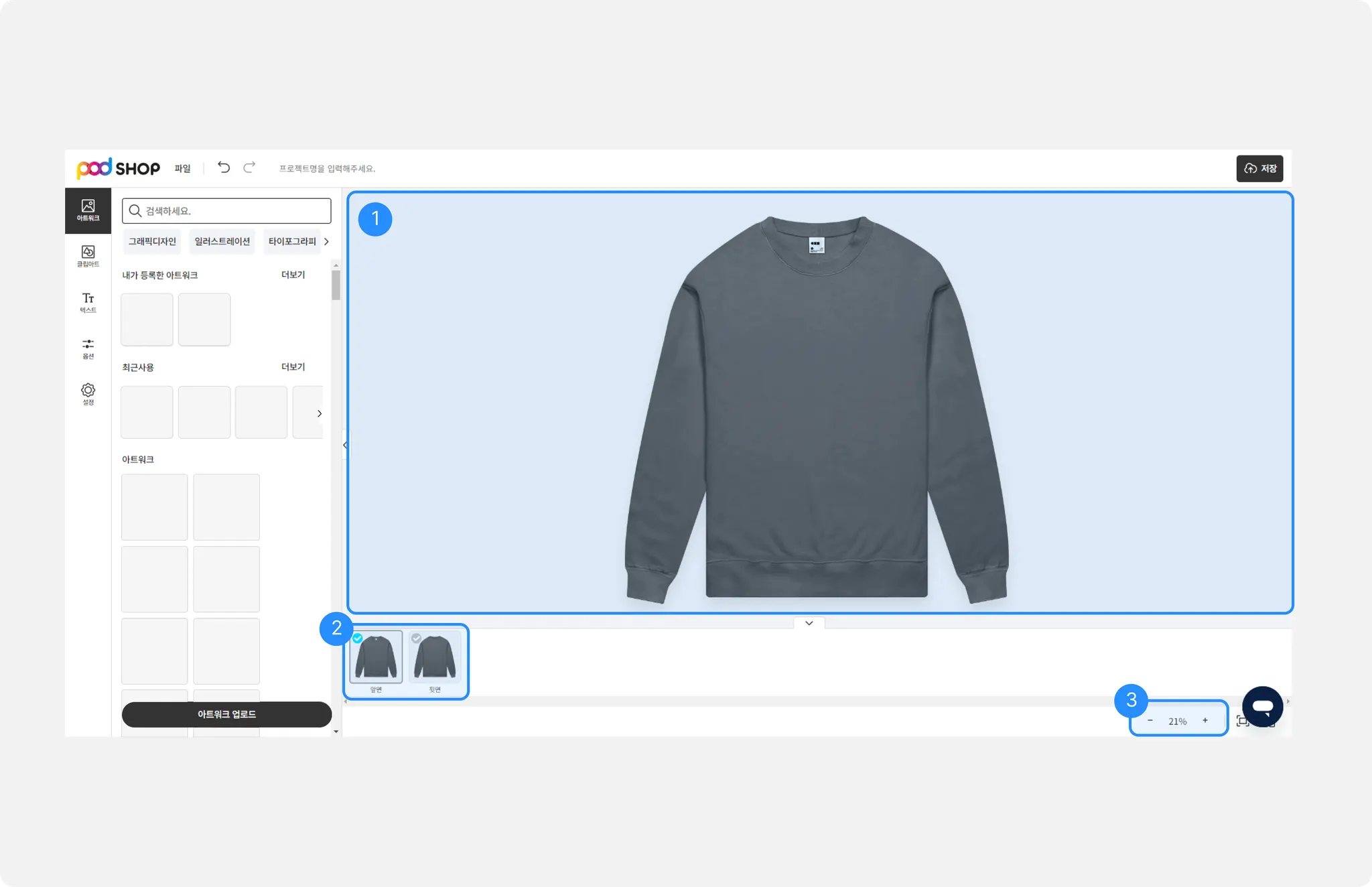맨투맨 상품의 경우, 앞면과 뒷면이라는 편집 영역이 존재합니다.