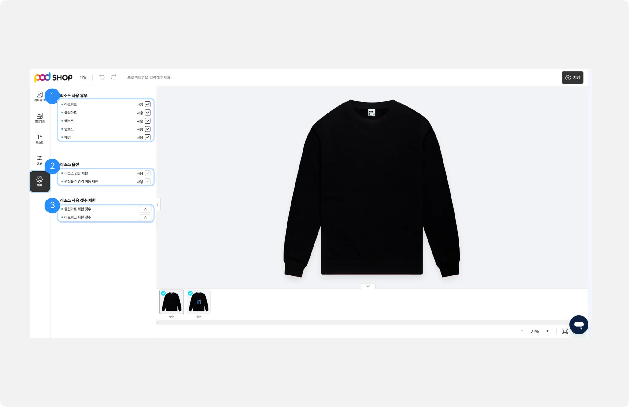 3 | 리소스 사용 갯수 제한 | 각 디자인 요소를 사용할 수 있는 개수에 대해 제한하는 기능으로, POD 상품에서 사용한 디자인 요소 개수와 고객이 추가로 사용한 디자인 요소 개수를 합하여 제한함