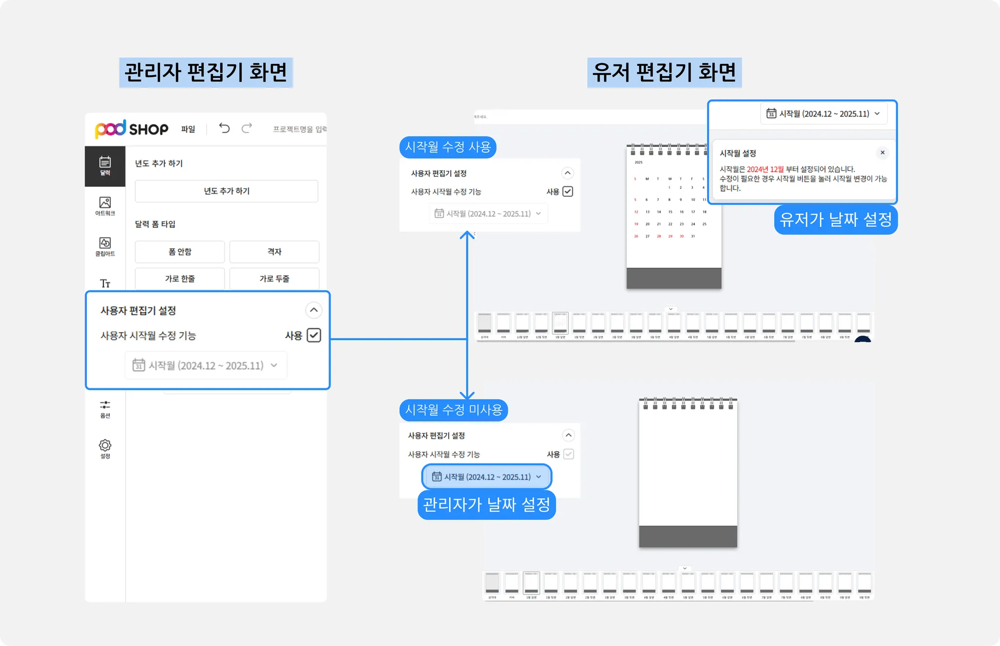 달력 상품에만 해당하는 기능으로, 유저가 디자인 뿐만 아니라 시작월을 수정할 수 있게 설정하는 기능입니다.