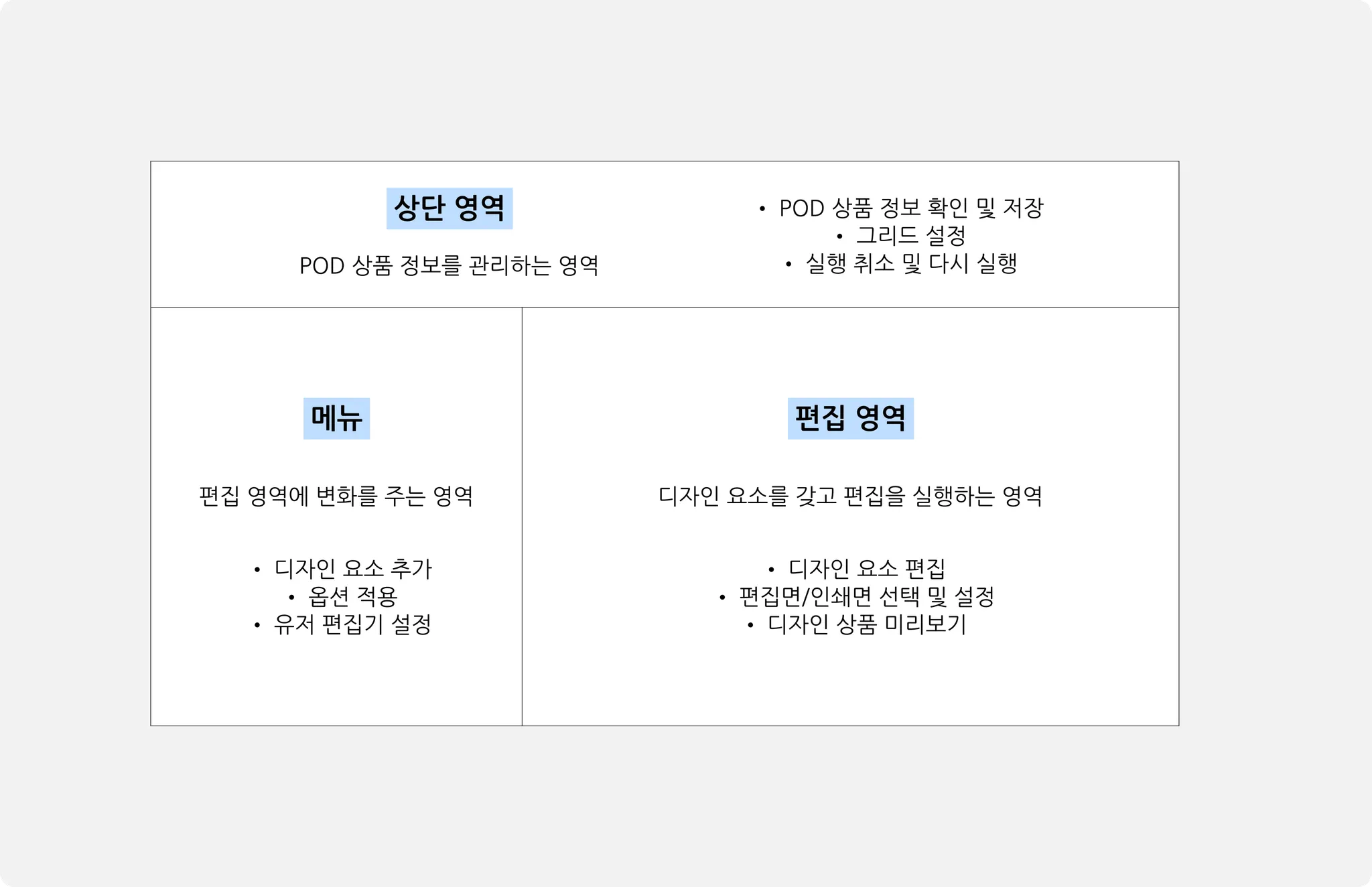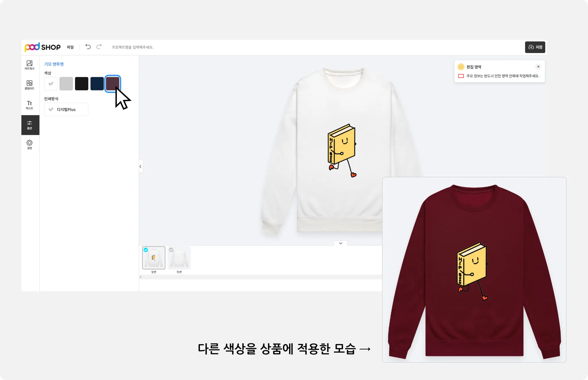 때문에 POD SHOP은 각 상품의 특성에 맞춰 편집기 화면을 조금씩 다르게 제공하고 있습니다.