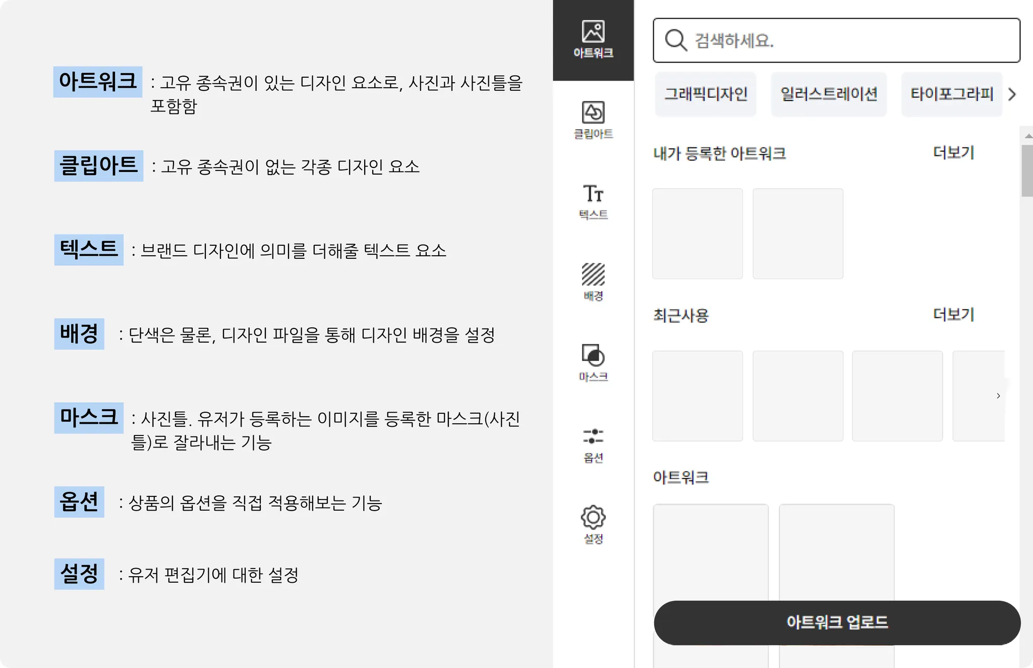 - 업로드: 유저 편집기에서 추가로 사진 또는 이미지를 올릴 수 있는 기능 |