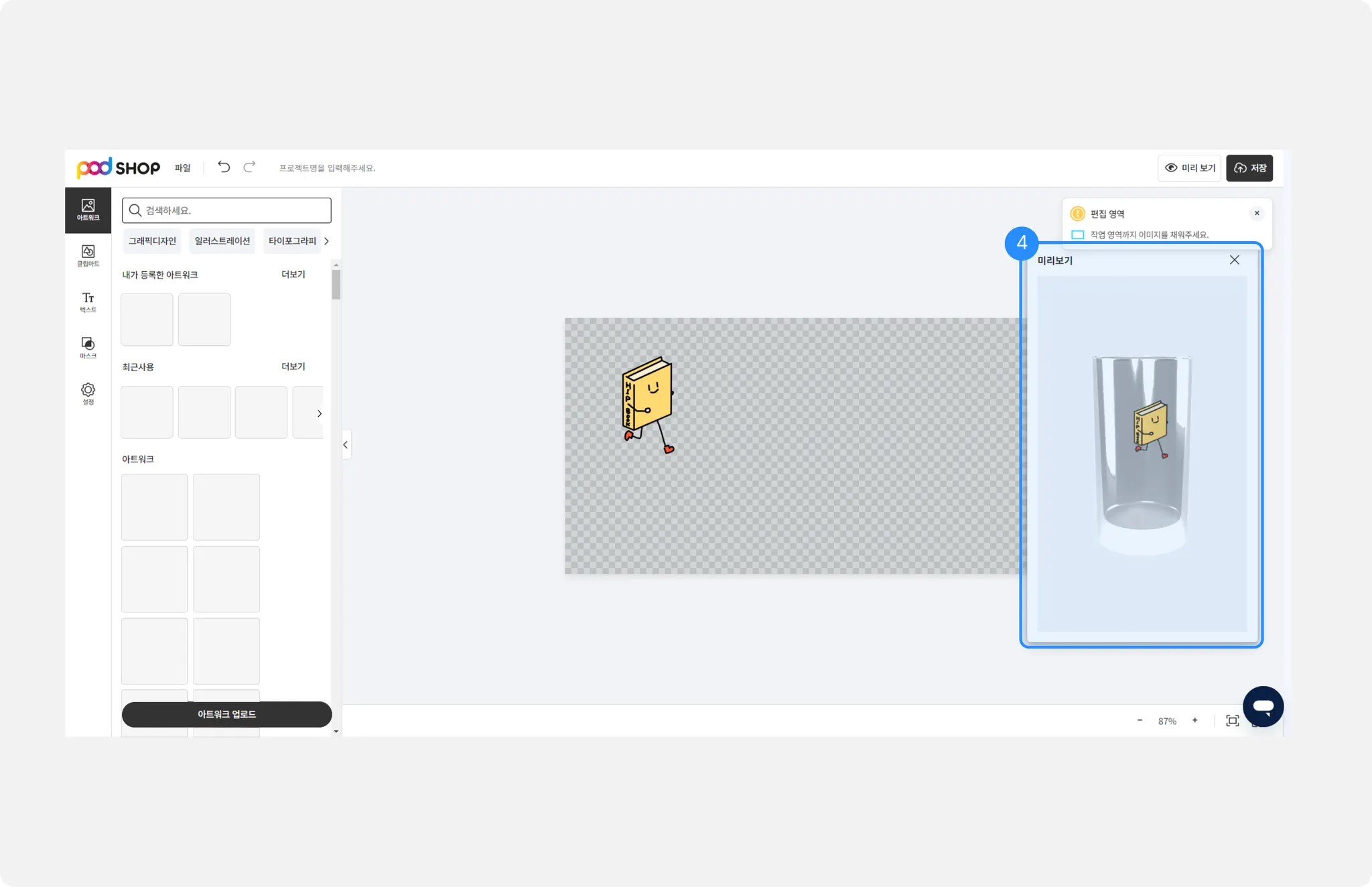 4 | 미리보기 | - 단순 편집영역으로는 실제 상품을 상상하기 어려운 경우, 상품에 디자인이 적용된 모습을 볼 수 있게 “미리보기” 버튼을 제공함 |