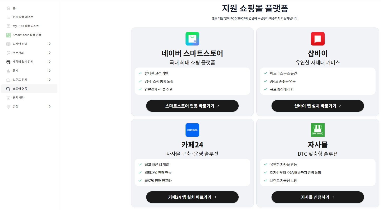 하나의 POD SHOP 채널에서 카페24, 스마트스토어, 자사몰, 샵바이 등 여러 개의 플랫폼을 연동해 하나로 관리해 보세요.