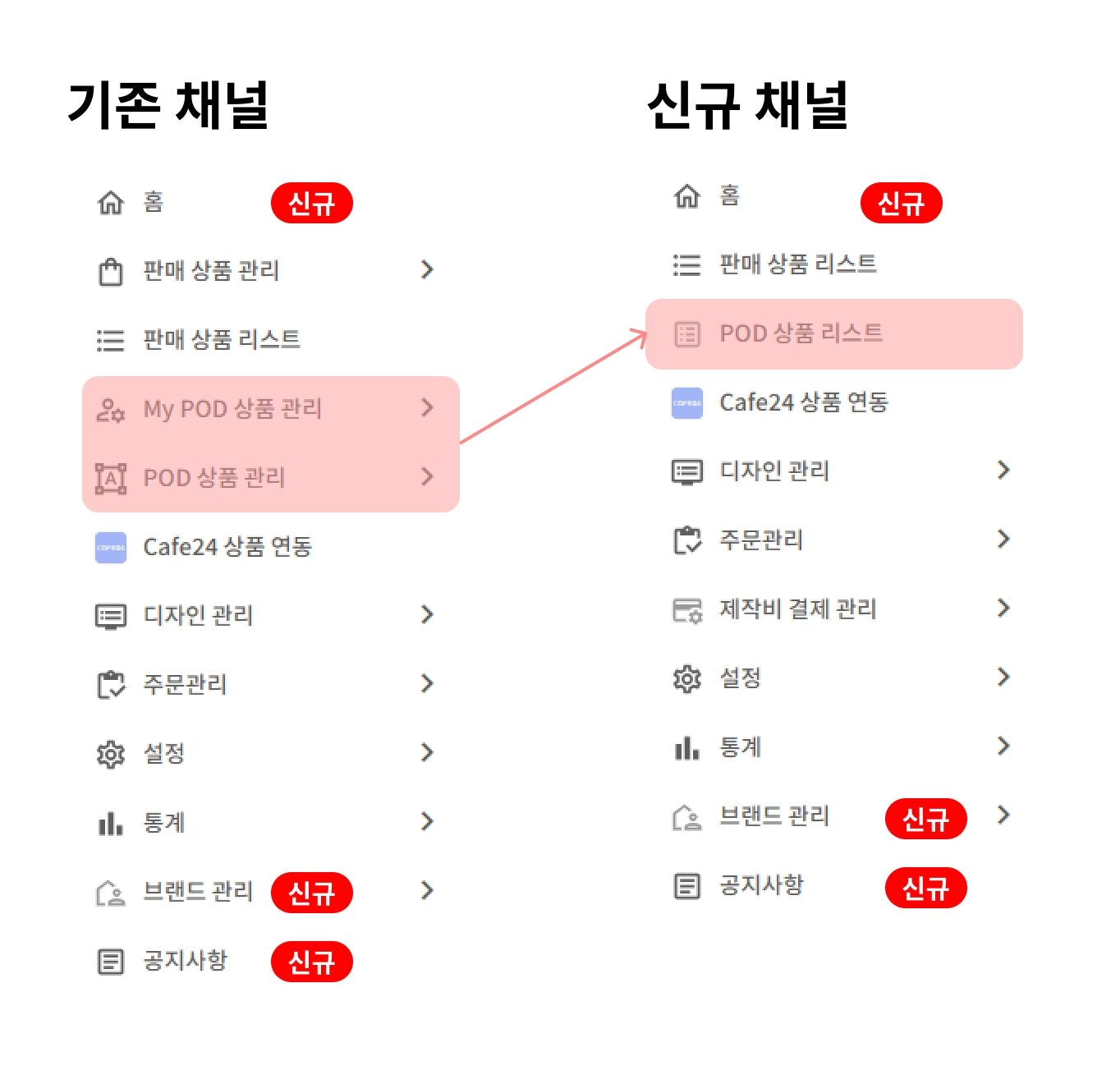 기능 개선 이전 POD 상품 메뉴 통폐합