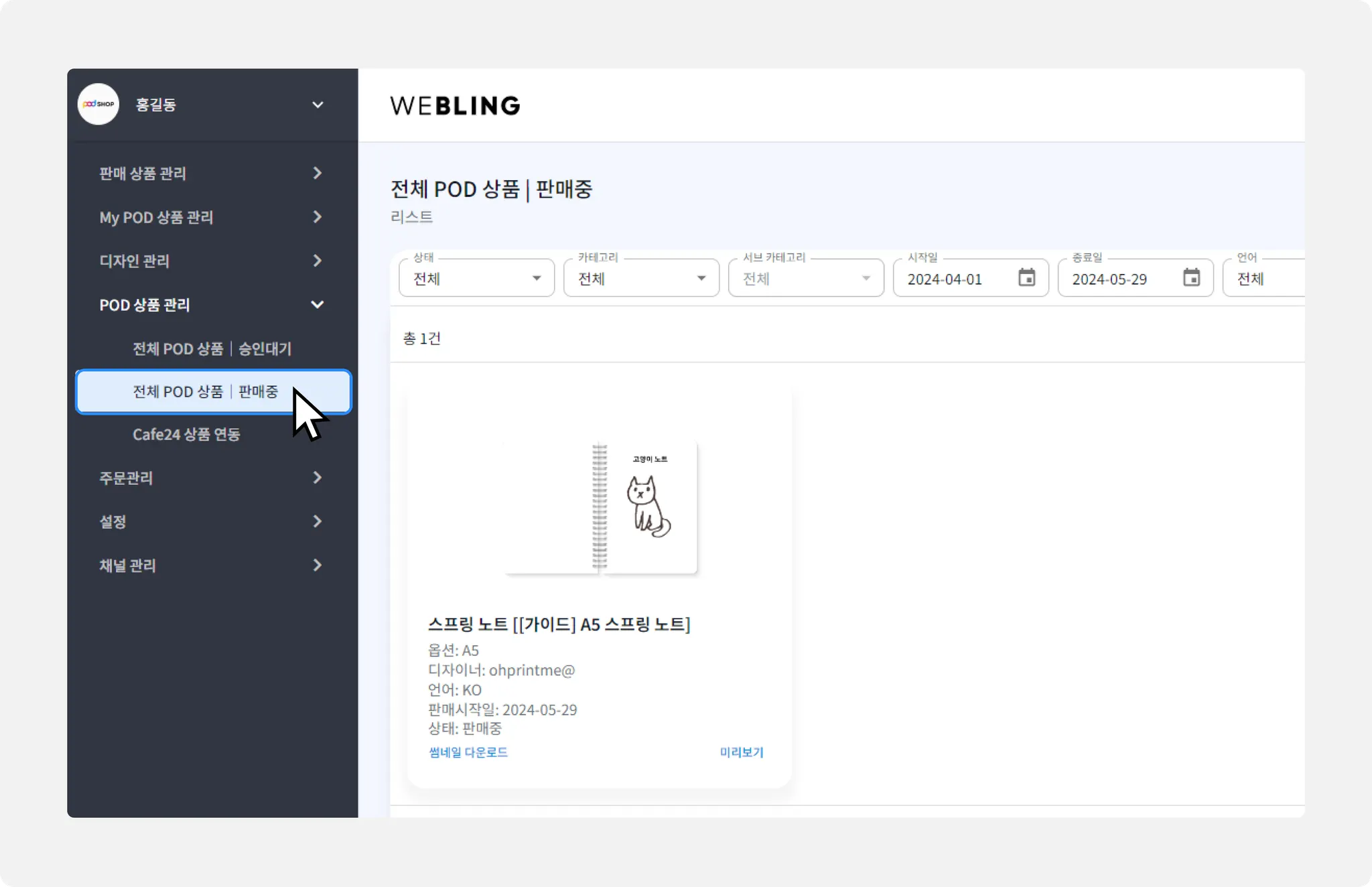 판매 승인이 완료되었다면, POD 상품 관리 > [전체 POD 상품 | 판매중] 메뉴를 통해 상품의 상태가 판매중으로 잘 변경되었는지 확인해주세요.