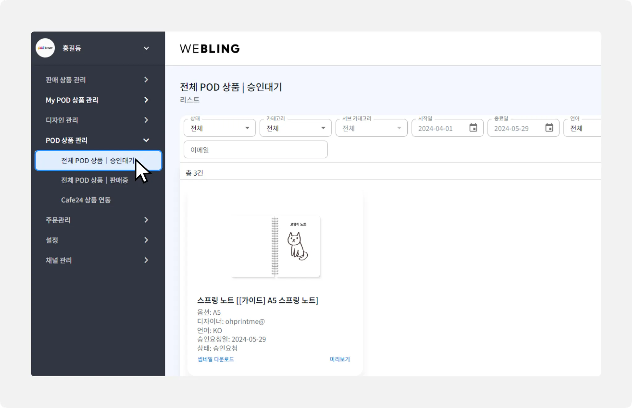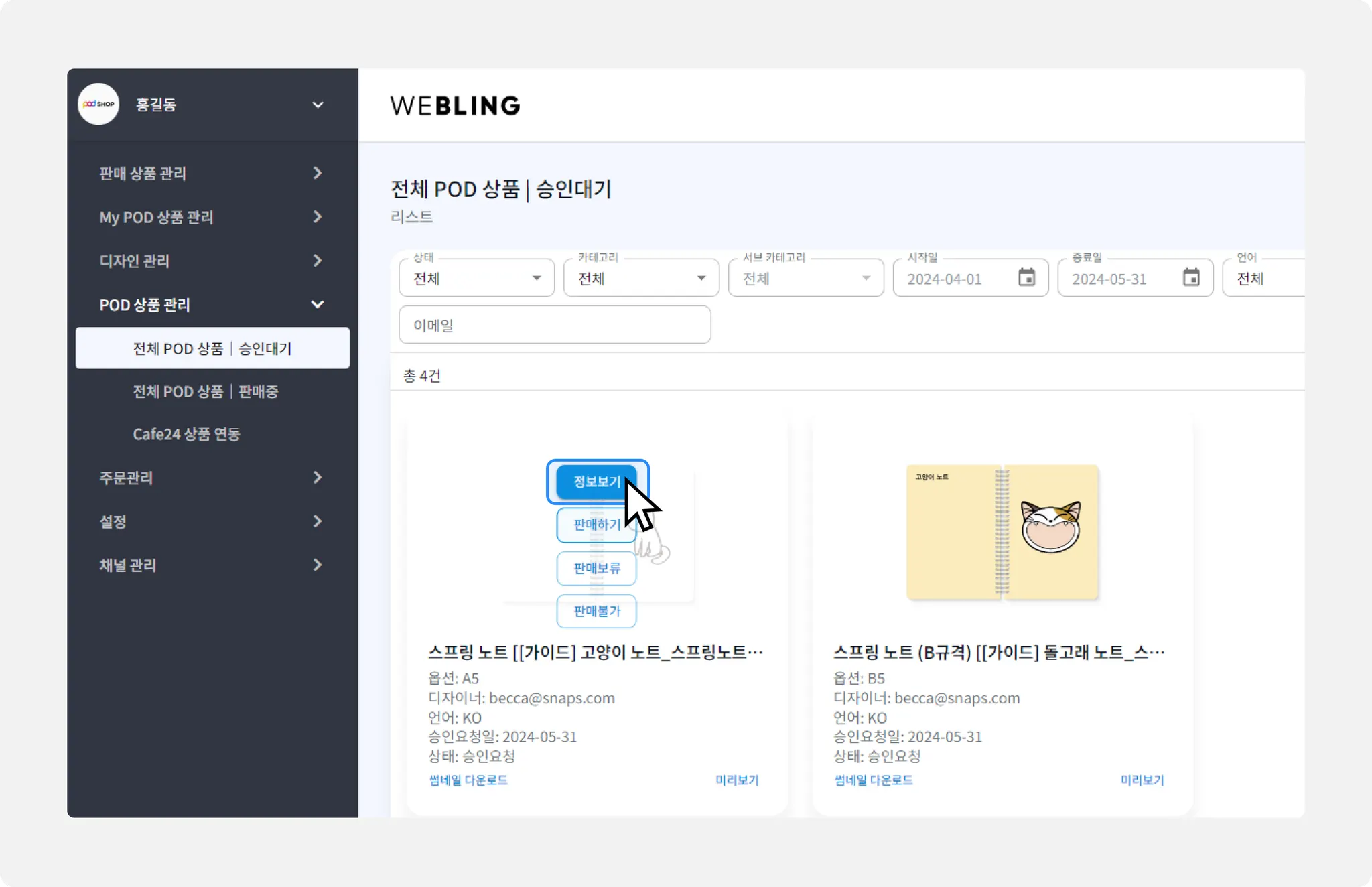 디자이너가 등록한 POD 상품을 판매하기 위해서는 해당 POD 상품들에 대해 운영자가 승인 작업이 진행되어야 합니다.