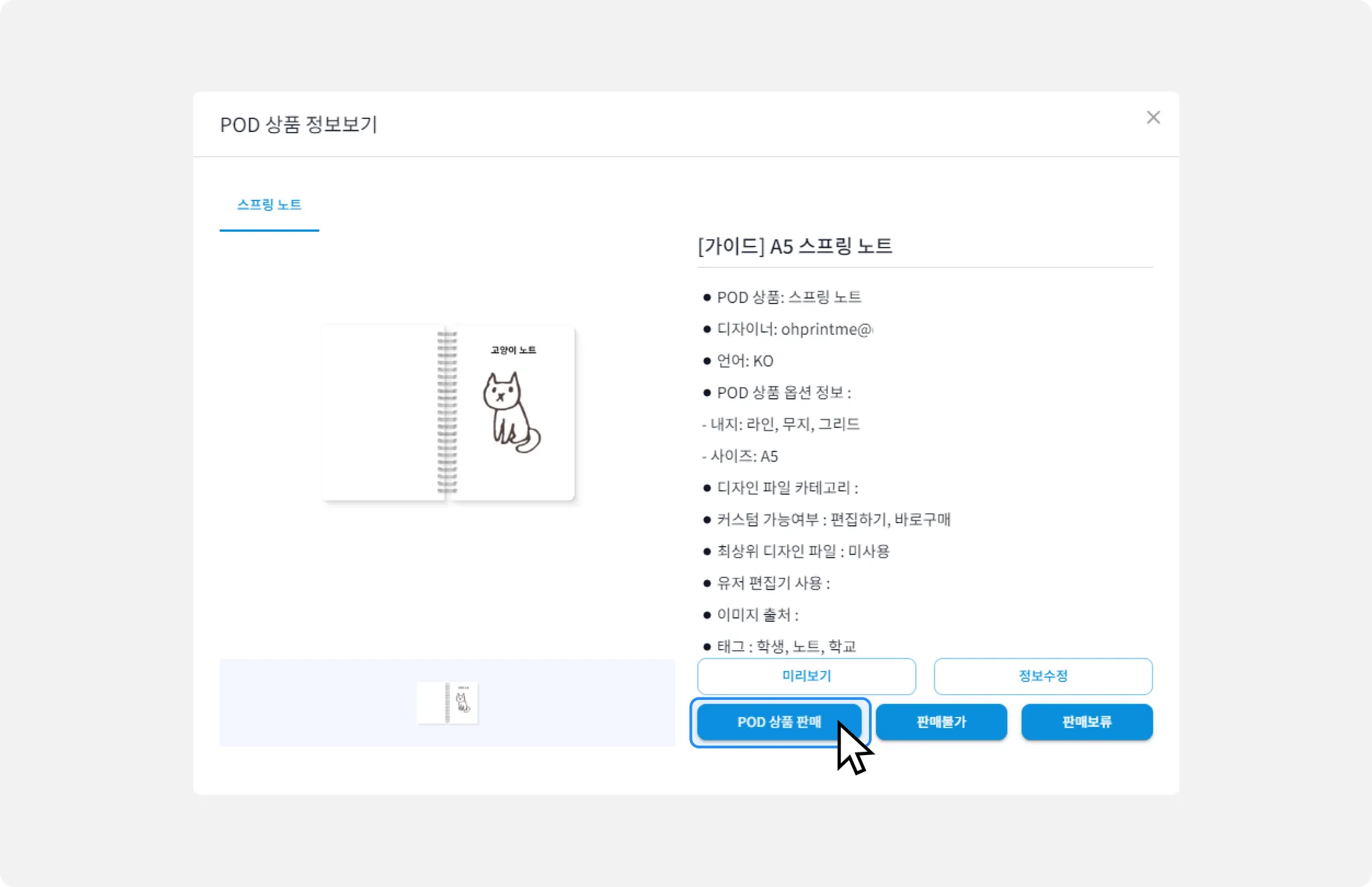 해당 상품의 정보를 확인한 뒤 상품 판매를 승인하고 싶다면, “POD 상품 판매” 버튼을 클릭합니다.