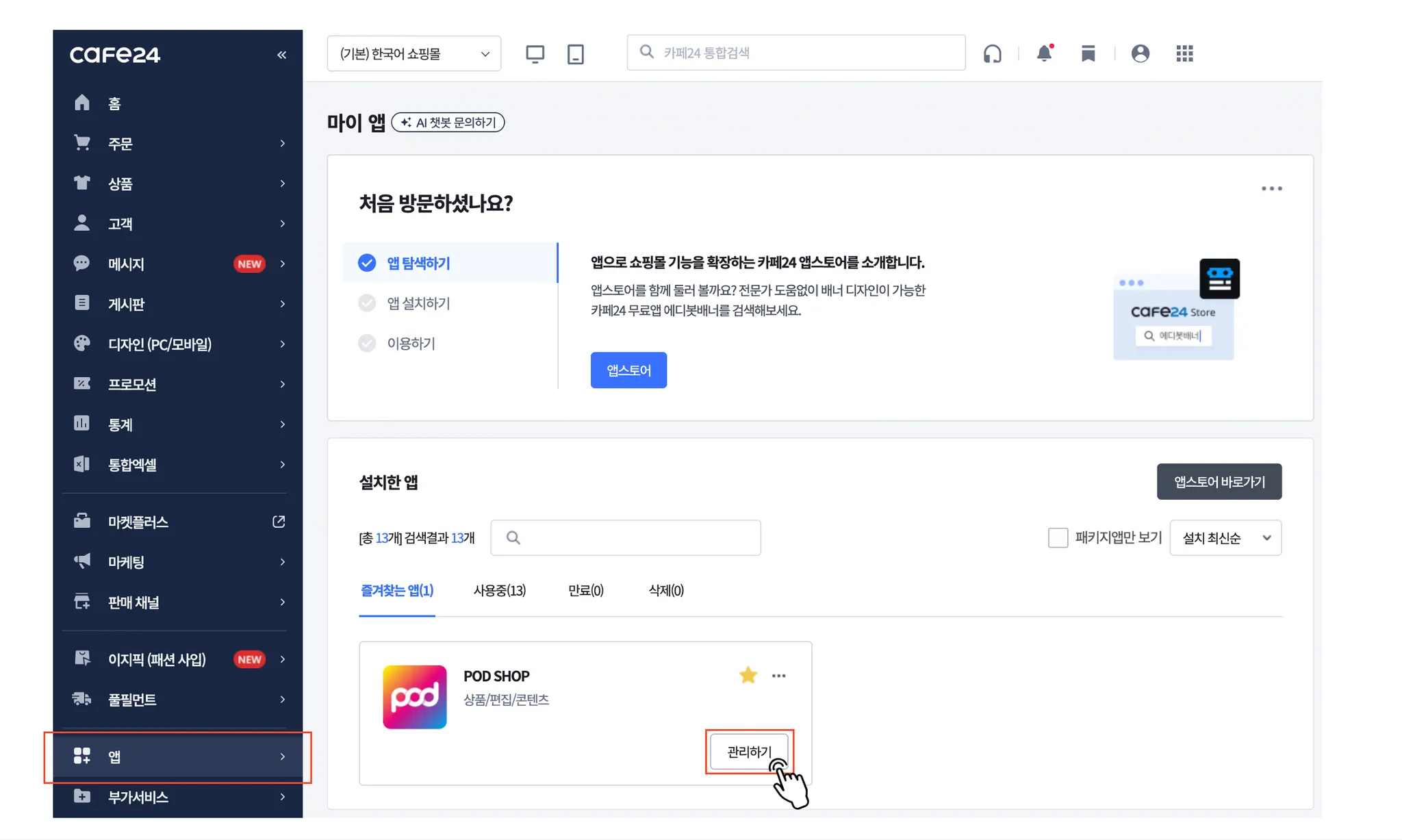 Cafe24 앱 추가를 하여 POD SHOP을 이용하실 수 있습니다.